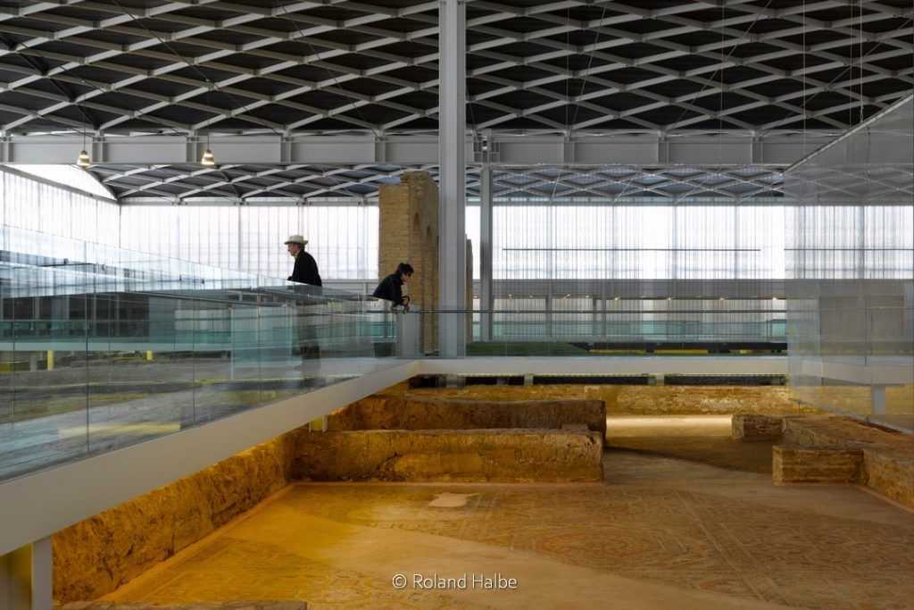 The aim is to present the visitor with a complex organism with excavated sections and the various rooms that make up the town discovered to avoid devising the entire excavation at a single glance. The interior route, which is carried out employing a wooden walkway, surrounds the impluvium at a high level because of the mosaics, leading the visitor to the hot springs. This walk widens and narrows according to the points of contemplation of the mosaics under the continuous roof that surrounds the excavation.